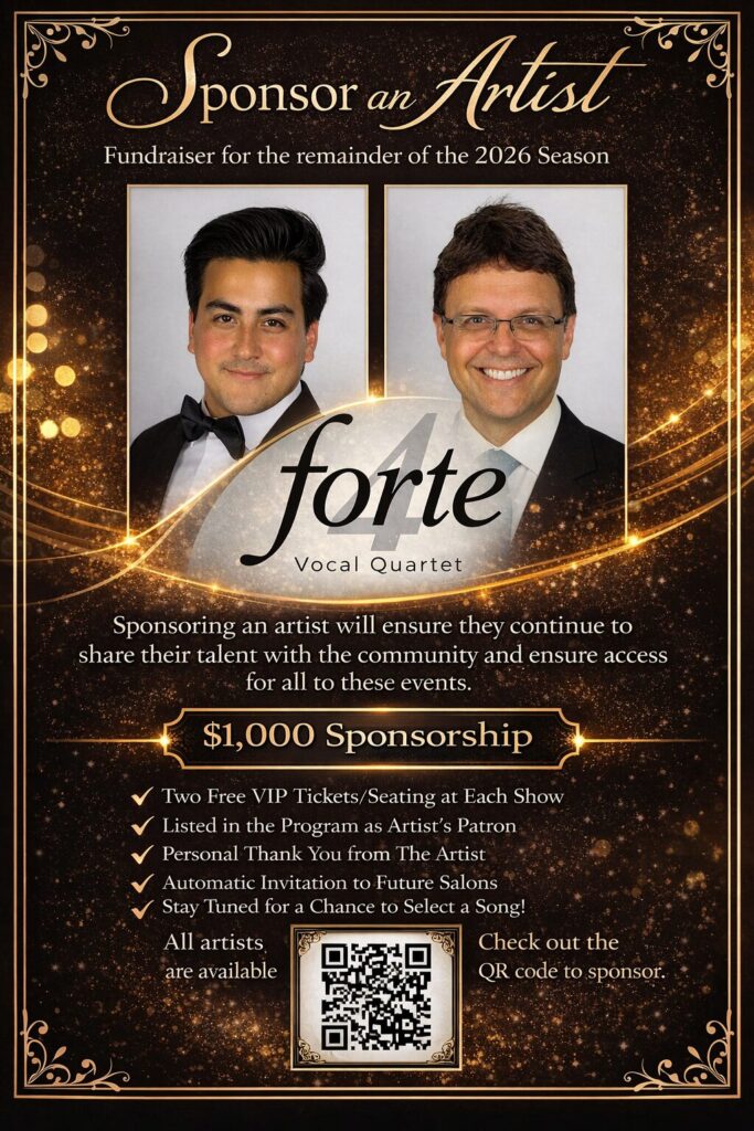 Sponsorship We have multiple ways to donate to Forte Vocal! See also: Donate Sponsor An Artist Learn about our Pro-Bono events! Learn More Contact Us